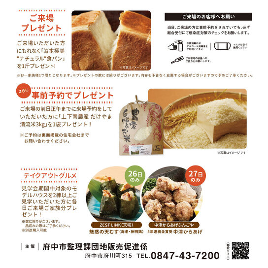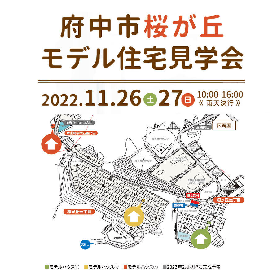 【府中市桜が丘】モデル住宅見学会のご案内 イベント 2022/11/01 2022年11月26日・27日の土日に、府中市桜が丘にてモデル住宅見学会を行います。 府中市が主催で、複数のメーカーの住宅を見学することができます。 ご来場・事前予約プレゼントやテイクアウトグルメなどもございますので、 現在マイホーム検討中の方、そうでない方もぜひお越しください!!