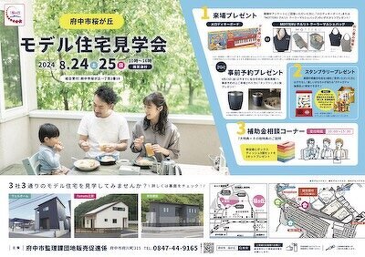 2024年8月25日㈯、26日㈰ 府中市桜が丘モデル住宅見学会開催! イベント 2024/08/06 2024年8月24日・25日の土日に、府中市桜が丘にてモデル住宅見学会を行います。 府中市が主催で、複数のメーカーの住宅を見学することができます。 ご来場・事前予約プレゼントなどもございますので、 現在マイホーム検討中の方、そうでない方もぜひお越しください!!
